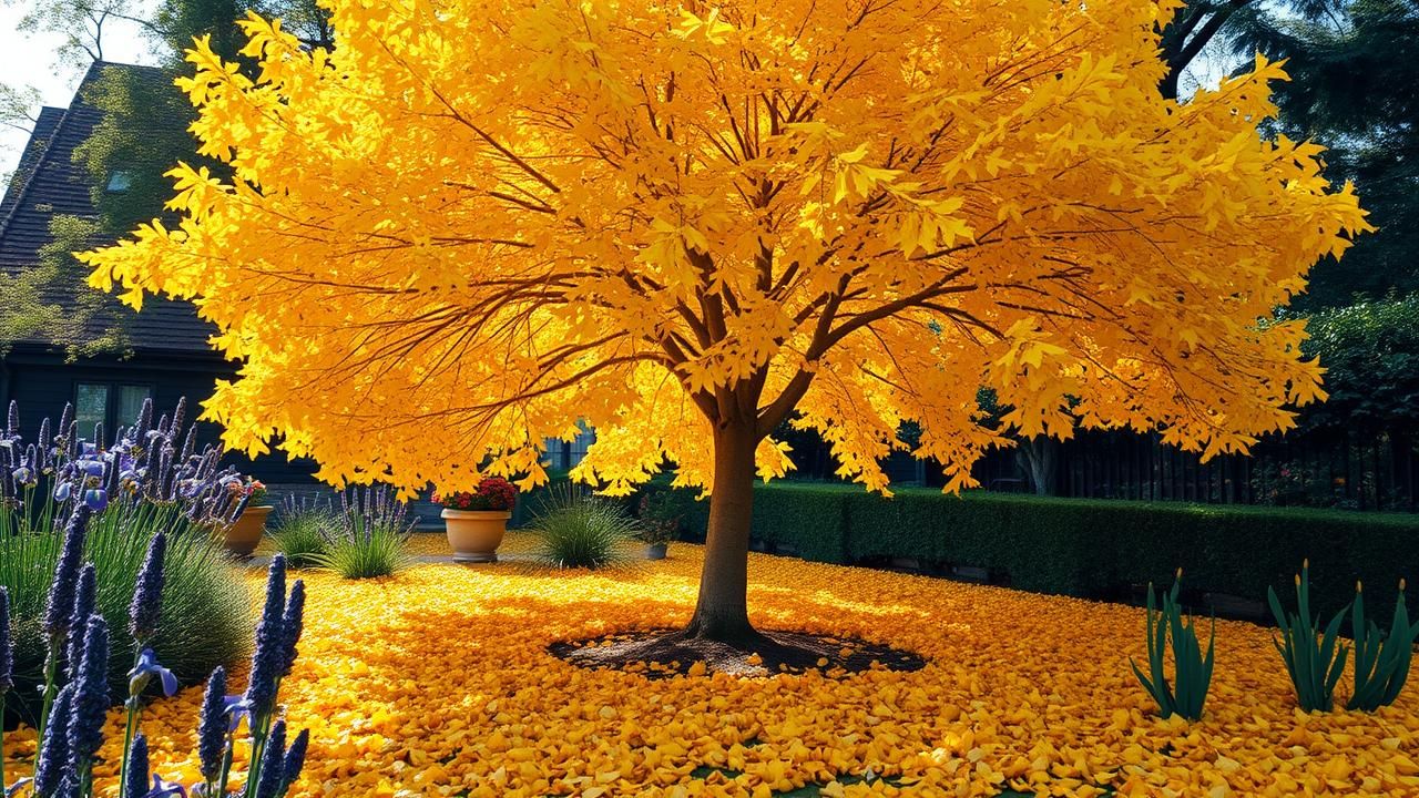 Pour valoriser le ginkgo, on peut l’accompagner de plantes vivaces tolérantes à la sécheresse : lavande, iris des marais, gaura lindheimeri, ou encore stipa tenuissima pour un effet de mouvement. Autour du tronc, un paillage de galets blancs ou de copeaux de bois clair met en valeur la chute des feuilles dorées. En hiver, quelques bulbes de jacinthes ou de crocus peuvent fleurir sous l’arbre, offrant une touche de couleur avant le réveil du feuillage.