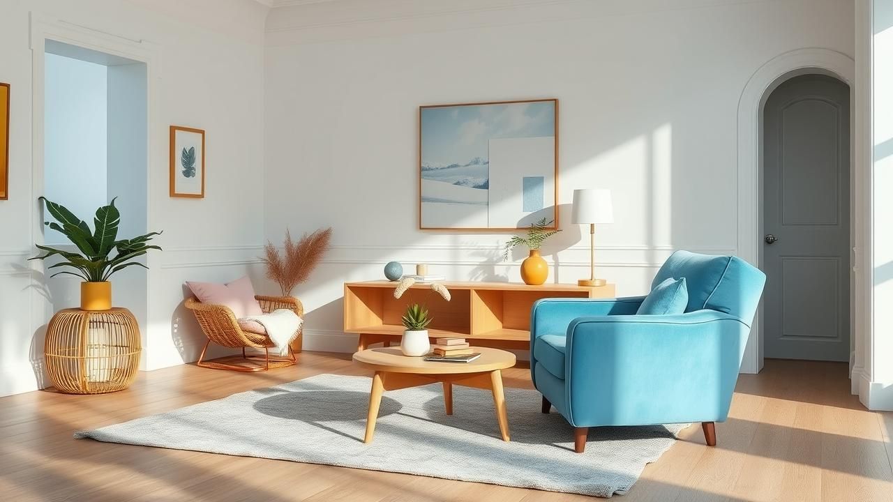 Pour équilibrer le côté parfois froid du bleu pastel, privilégiez les matières naturelles (bois, rotin), les textiles chauds (laine, velours), et les touches de métal doré ou noir.