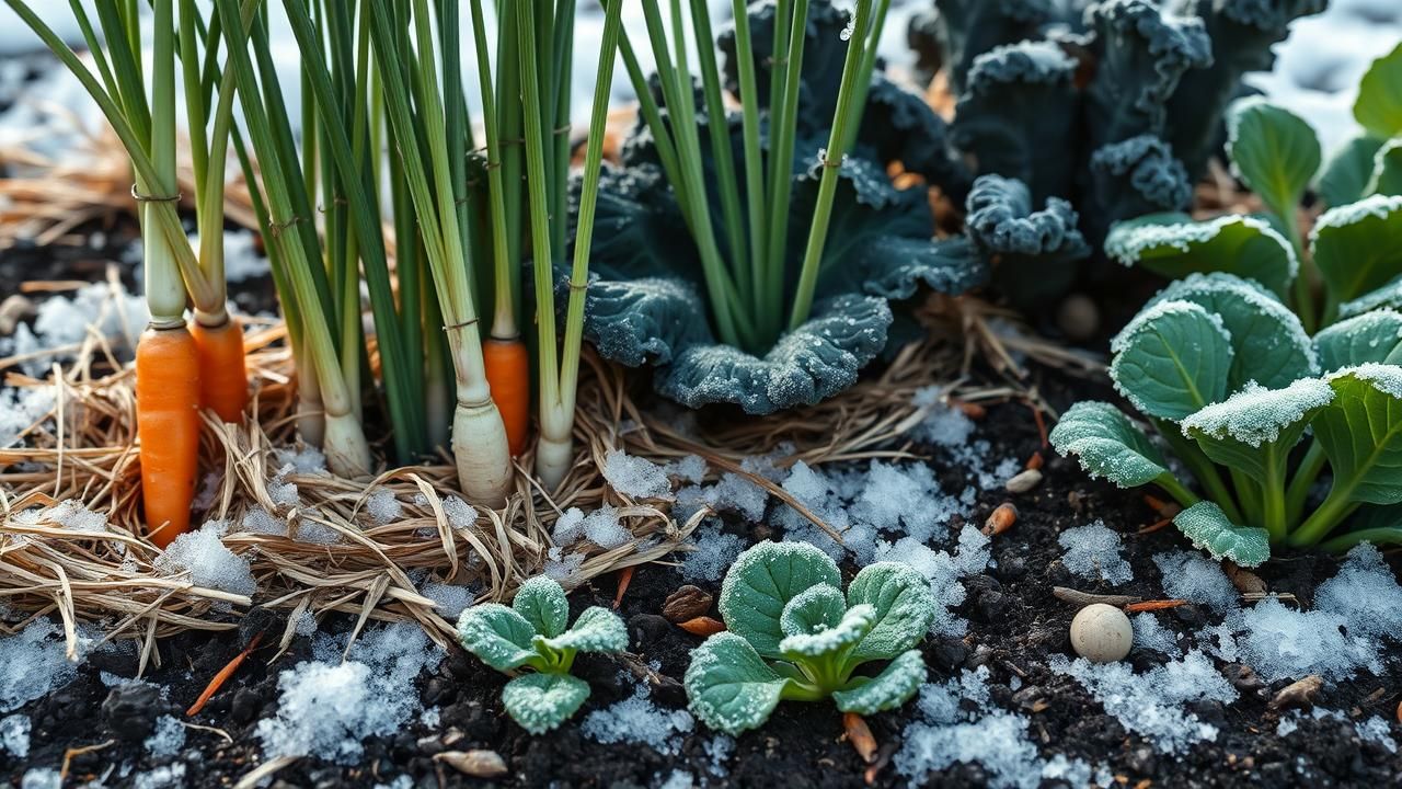 Carottes, poireaux, choux (kale, frisé, de Bruxelles, rouge), mâche, épinards, brocoli, ail, oignons et échalotes peuvent tous pousser en pleine terre pendant l’hiver, à condition d’être semés ou plantés à l’automne et correctement paillés.