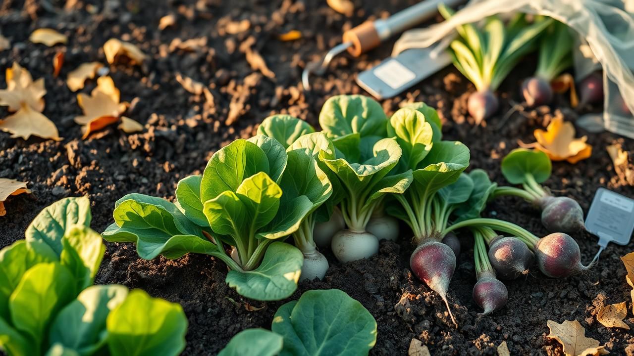 Le navet précoce est récoltable en 6 à 8 semaines, le radis d’hiver en 10 à 12 semaines, et l’épinard d’hiver peut être cueilli dès que les feuilles atteignent 10 à 15 cm, généralement deux mois après le semis.