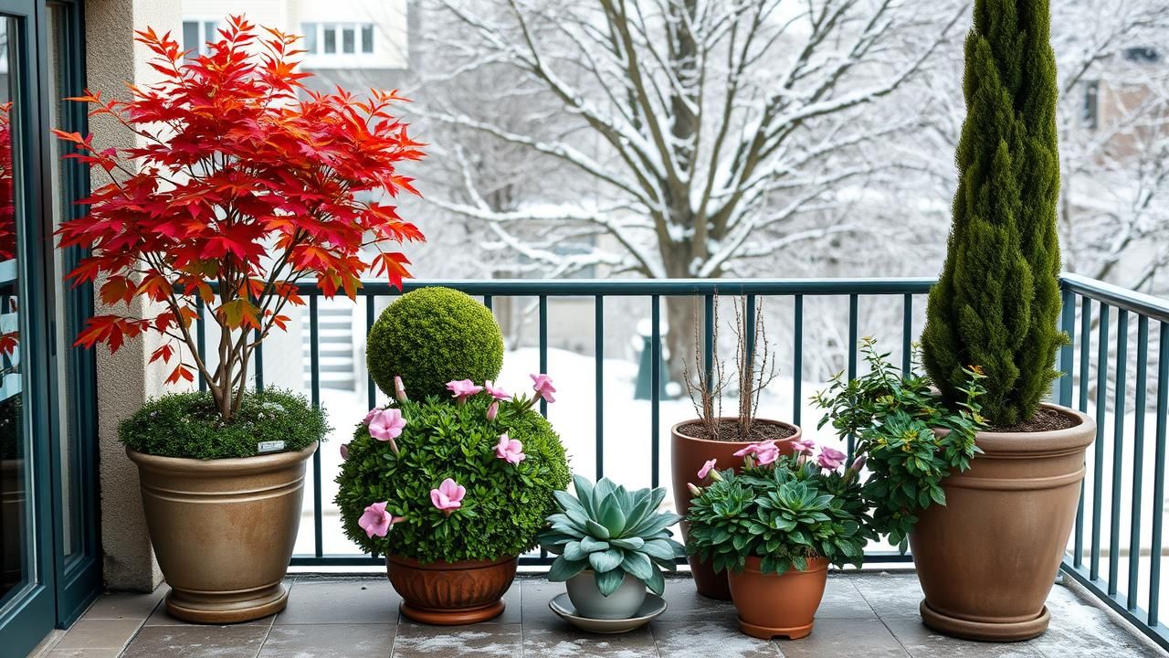 L’érable du Japon, le buis, le laurier-rose, le sédum et le cyprès de Provence sont des espèces particulièrement adaptées aux hivers froids, surtout lorsqu’elles sont cultivées en pot et légèrement protégées.