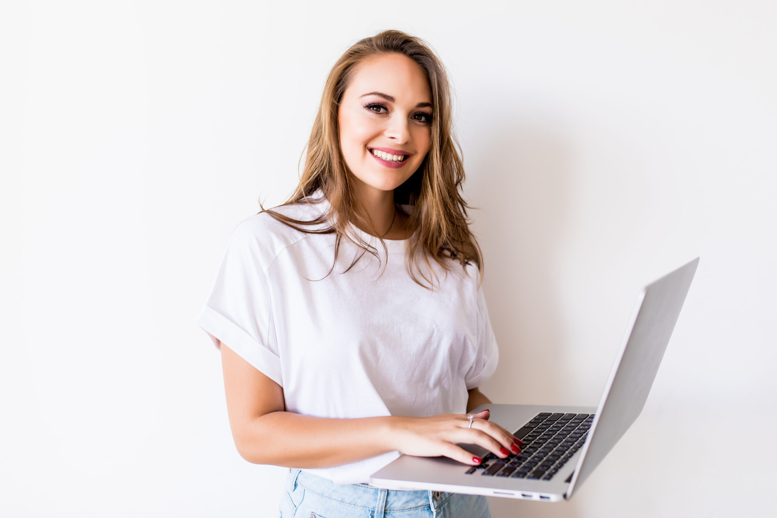 Young happy smiling woman in casual clothes holding laptop and sending email to her best friend